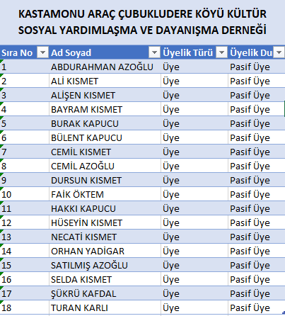 Çubukludere Köyü Kült. Sos. Yard. ve Day. Derneği Üye ve Telefon Listesi